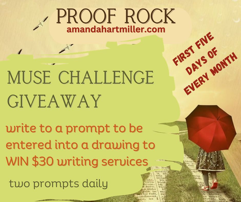 Respond to either prompt by emailing amandahartmiller@gmail.com by midnight on the 5th of the month to be added to a monthly drawing to win $30 toward developmental editing, consulting contracts, or writing communities. You will be entered into the monthly drawing once for every day you respond, up to 5 times per month.